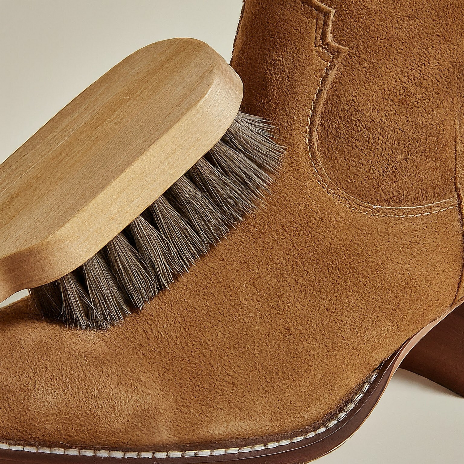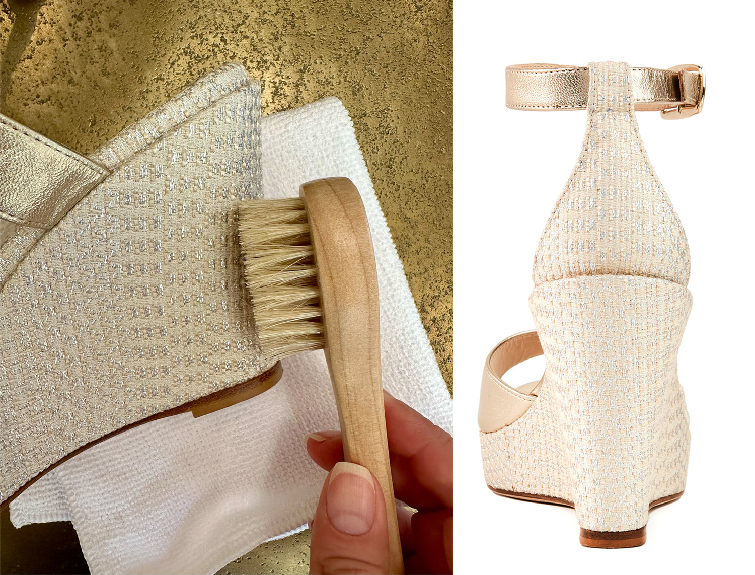 The best way to care for suede is prevention. Water and stain guards can be purchased at a cobbler or drugstore. It’s always worth testing the stain guard on a small section of your shoes before you treat the whole pair to avoid any damage. Keep suede heels out of direct sunlight for long periods and if your suede shoe gets wet, soak up the moisture as soon as possible with a clean towel and allow it to air dry, then brush the nap with a suede brush. For light marks, use a soft dry brush on the suede.