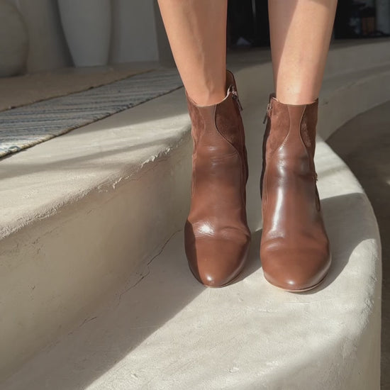 Crafted in Italy in a rich brown hue, the Cora bootie features a sculpted almond toe and a slim 75mm block heel that offers the look of a stiletto with the support of a block. A curved front panel adds soft dimension, while a tonal side buckle defines the silhouette. Lined in soft goat leather, the upper offers comfort while maintaining structure.
